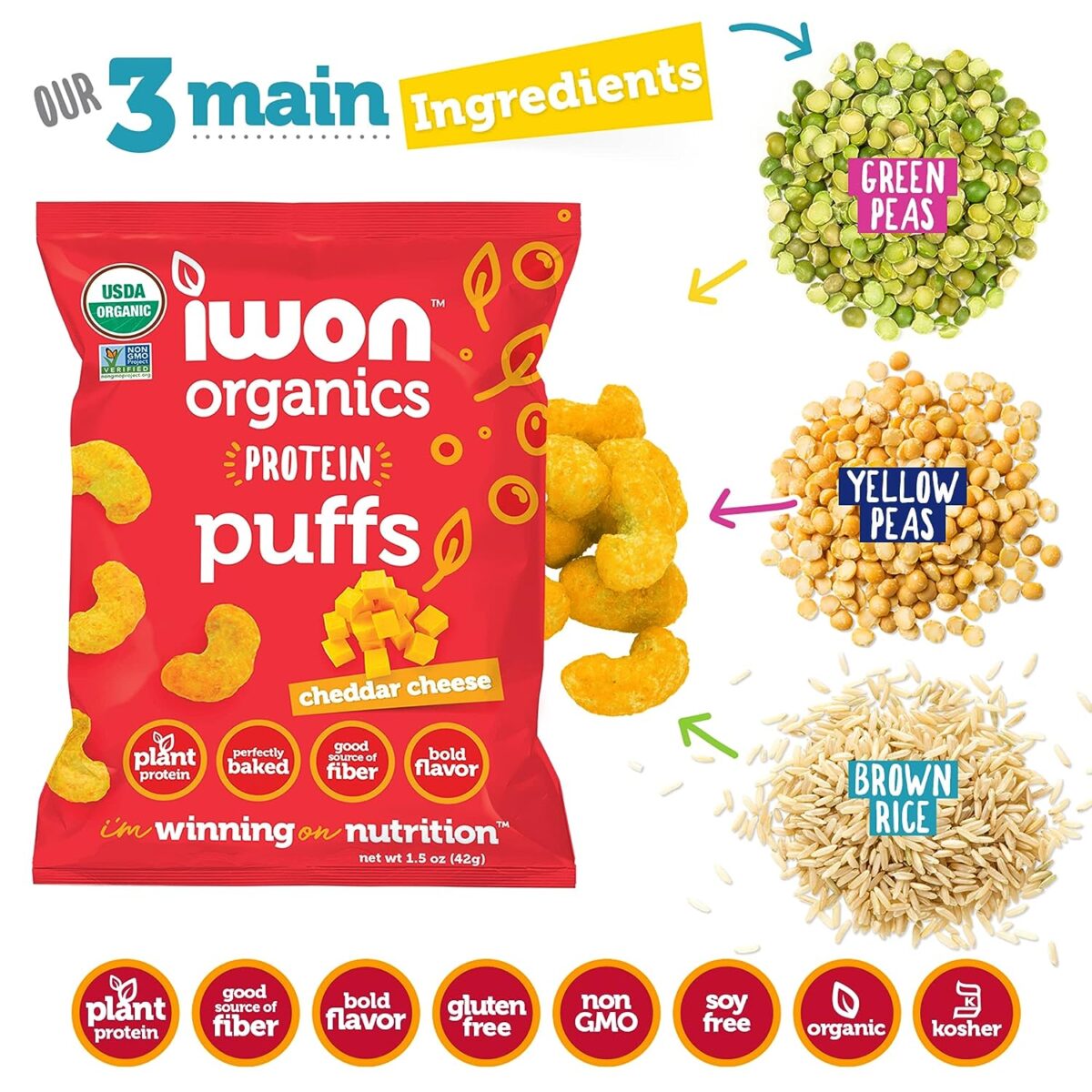- Iwon Organics Protein Puffs Cheddar Cheese Flavor, Vegan, Certified Non GMO, Certified Kosher, Soy Free, Gluten Fee, 5 Ounce (Pack of 12)